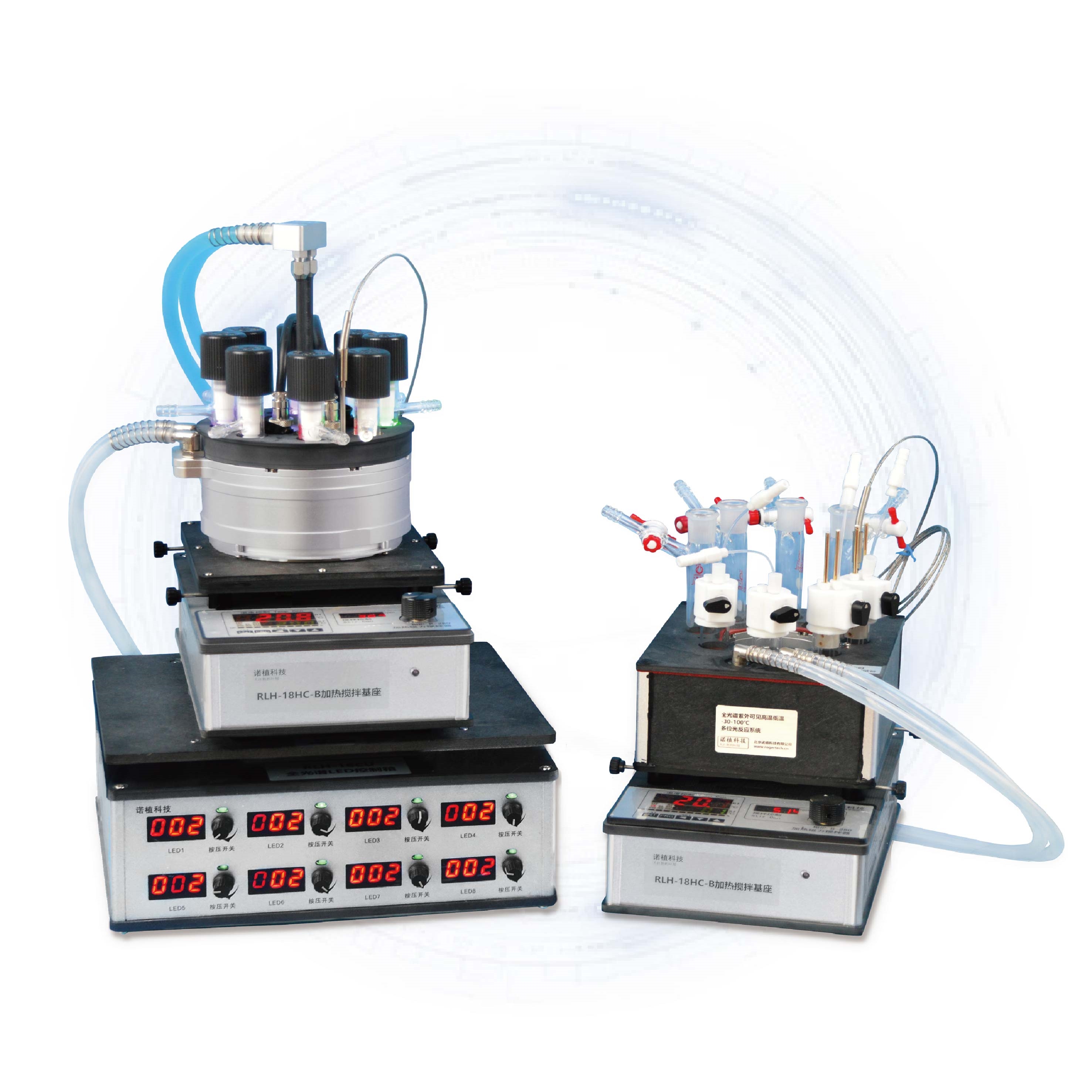 采用臥式控制箱,反應(yīng)系統(tǒng)可以疊放于控制器上,節(jié)省實驗臺面積。8個獨立LED開關(guān)及亮度控制器,更利于不同光照強度下的平行反應(yīng)研究。因為只點亮使用位置的LED光源,其他位置的LED光源使用壽命可以不浪費。