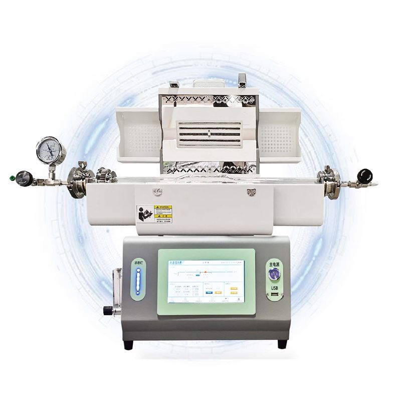 本產品適用于粉末材料回轉燒結,物料均勻旋轉受熱效果好。石英爐管放置于爐體中間,爐管另一端采用卡箍連接旋轉密封組件,方便物料出入及管內氣壓監測。