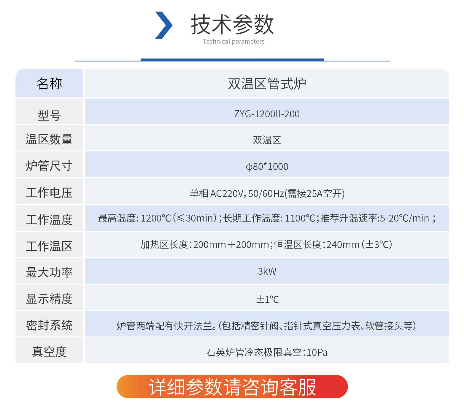| 內(nèi)部尺寸 | 加熱區(qū)200mm+200mmmm | 最大功率 | 3kW |